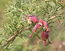 Grevillea patentiloba is a prostrate to erect, spreading to straggling shrub that typically grows to a height of 0.3–3 m (1 ft 0 in – 9 ft 10 in). Its leaves are 15–50 mm (0.59–1.97 in) long and 15–65 mm (0.59–2.56 in) wide in outline, and pinnatisect to pinnatipartite or pinnatifid with 3 to 7 lobes widely spreading lobes, usually divided again, the end lobes linear to oblong or triangular and sharply pointed, 3–20 mm (0.12–0.79 in) long and 1–9 mm (0.039–0.354 in) wide. The edges of the lobes are turned down or rolled under, enclosing most of the lower surface. The flowers are arranged in down-turned clusters of 2 to 10 flowers on a silky-hairy rachis 1–5 mm (0.039–0.197 in) long, the pistil 15–20 mm (0.59–0.79 in) long. The flowers are red to deep pink and cream-coloured to bright yellow, the style red to deep pink. Flowering time depends on subspecies and the fruit is a glabrous follicle 10–14 mm (0.39–0.55 in) long.[2][3]