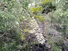 Grevillea subtiliflora is an open, erect shrub that typically grows to a height of 1.0–2.5 m (3 ft 3 in – 8 ft 2 in) and has densely silky-hairy branchlets. Its leaves are pinnatisect, 25–45 mm (0.98–1.77 in) long with 3 to 11 lobes that are usually further divided, the end lobes linear, 5–20 mm (0.20–0.79 in) long and 0.5–1 mm (0.020–0.039 in) wide. The edges of the leaves are rolled under, enclosing the lower surface apart from the midvein. The flowers are borne in cylindrical clusters in leaf axils and at the ends of branches on a silky-hairy raceme 40–80 mm (1.6–3.1 in) long. The flowers are yellowish green in the bud stage, later white, the pistil 4–5 mm (0.16–0.20 in) long. Flowering occurs from July to October and the fruit is an oval or oblong follicle 8–10 mm (0.31–0.39 in) long.[2][3][4]
