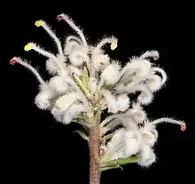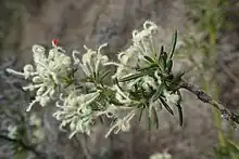 Grevillea uncinulata is an erect, open shrub that typically grows to a height of 15–100 cm (5.9–39.4 in). It has linear to elliptic leaves 2–10 mm (0.079–0.394 in) long and 1–2.5 mm (0.039–0.098 in) wide arranged in clusters along the branches. The edges of the leaves are rolled under, concealing the lower surface apart from a longitudinal groove. The flowers are arranged in small clusters, the flowers near the far end of the rachis flowering first. The flowers are hairy and white with a yellow-, orange- or red-tipped style, the pistil 7–10 mm (0.28–0.39 in) long. Flowering occurs from May to November, and the fruit is a shaggy-hairy, oblong to elliptic follicle about 8 mm (0.31 in) long.[2][3][4]