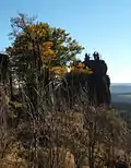 From the northern lookout rocks, the path runs along below the summit which, according to an inscription, is actually 873 metres high. From the path there is a further view of the Rhön mountains. Continuing towards the viewing rocks there is a view looking east by a small rock (see photograph below). The actual viewing rocks may be climbed using steps hewn out of the rock and a safety cable; the top is protected by railings. The top of these rocks is recorded on all the maps as being 867 metres high.