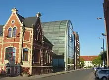 In 1960, two half-timbered granaries located on the fish market burned down. In 1973, a square with a fountain has been built nearby Mostowa street where the houses demolished in 1940 stood.[9] The northernmost part of Grodzka street has been rebuilt in 2006–2007, works being completed in 2015 including: the Grodzka street section from Mostowa St. to Podwale St. (repaved), the bridge, entirely restored, and Jatki street, between old market square and Grodzka, renovated. After 1990, new distinctive modern buildings appeared in the street including: mBank seat in Bydgoszcz, recognizable by its glass granary architecture has been erected in 1996–1998, and the three star Holiday Inn hotel, built in 2008–2010 at the eastern end of the street. The modernization of the street pavement was included in the Revitalization Plan of Bydgoszcz.[10]