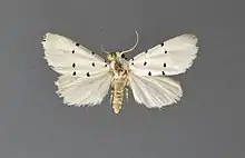 The noctuid species, G. septempunctata, has a pure white head and thorax with an abdomen brown, tinged with a yellowish white. The palpi and frons are black brown and the antennae are yellow. Tibiae and tarsi banded with black; forewing almost pure white; the costal edge black towards base; subbasal black points below costa and cell; small antemedial black spots on costa, in submedian fold, and on inner margin, the spot in the fold slightly nearer the base; small postmedial black spots on costa, discocellulars, in submedian fold and on inner margin. Hindwing white, the apical area to the discocellulars and vein 3 tinged with fuscous brown. Underside of forewing, except the inner area and cilia, and the costal area of hindwing fuscous brown.[2]