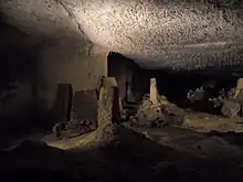 The Romans were present in the caves, as evidenced by the discovery of pottery, manual mills, and a graveyard, with seven gravestones remaining.[3] The grottoes were mostly formed during the Middle Ages, the stone (tuffeau) being used to build châteaux. Centuries later, the caves were flooded with water, slowly creating new passages. They were visited by Bernard Palissy in 1547, and an extension (the second grotto) was discovered by a speleologist (Gilles) in 1947. In the 1960s, the grottoes were managed by their owner as to allow access to tourists. They were added to ANECAT (Association Nationale des Exploitants de Cavernes Aménagées pour le Tourisme), and have since become a popular tourist attraction.[4]