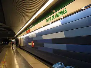 Gruta de Lourdes is an underground metro station on the Line 5 of the Santiago Metro, in Santiago, Chile. It is located close to the western branch of the Autopista Central and the Basilica of Lourdes. East of the station, Line 5 runs beneath Quinta Normal Park. The station was opened on 12 January 2010 as part of the extension of the line from Quinta Normal to Pudahuel.[1]