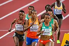 In the 1500 m final at the 2019 Doha World Championships, Tsegay (R in yellow) finished behind only Sifan Hassan (C) and Faith Kipyegon (L).