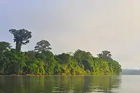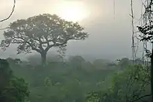 Tropical forest covers most of the territory of the Park where the number of vascular plants present is estimated at between 4,000 and 5,000 species (including more than 1,000 trees), or a tenth of the world's plant biodiversity.[13] The tallest trees such as the Hura crepitans and Ceiba pentandra can reach 55 to 65 meters in height.[14] A single hectare of forest frequently contains more different species of trees than the entire flora of Metropolitan France.[13]