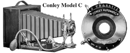 This all means that in outdoor settings, flash devices must be roughly nine-percent closer than their indoor-rated guide numbers indicate in order to obtain a full-rated luminous exposure. The above fill-flash tables give distances that have been adjusted accordingly. Also bear in mind that the distances given in the above tables do not obey the f‑number × distance formula when using the f‑stops shown in the first column because the fill-flash contribution is one f‑stop less than the sunlit portions of the scene—a 50% underexposure. The values may be correctly calculated by hand when the apertures shown in the first column are larger (numerically smaller f‑number) by one f‑stop. Those larger apertures, when expressed in industry-standard nomenclature, are f/11, f/8, f/6.3 (f/5.6 +⅓), and f/5.6 but have the following more precise values underlying the above tables: f/11.3137, f/8, f/6.3496, and f/5.6569 , , , and . - ↑ When Sashalite's instructions mentioned setting a shutter to its "Bulb" setting, the company was not referring to glass flashbulbs but to rubber bulbs. The Sashlite flashbulb was introduced at a time when the equipment typically used for professional indoor portraiture was a large-format studio view camera and a flash-lamp with flash powder in its tray. Advanced hobbyists in 1909—decades before the first flashbulbs—could buy portable folding cameras, made by Conley Camera Company, from Sears Roebuck for $4.75–$21.50 (equivalent to $163–$733 in 2024). With the exception of entry-level models, both view-type and folding cameras of this era came with a detachable pneumatic shutter release with a rubber bulb on the end, as seen at right on the $11.75 Model C. With the exception of their entry-level shutter, Conley's shutters—like the Conley Automatic (inset, far right)—had a "B" setting. Though mechanically timed exposures too could be triggered by squeezing the shutter release bulb, "bulb" exposures had the same momentary action as camera shutters have today, as per this description from Sears Roebuck's 1909 Cameras [&] Photographic Supplies, which devoted three pages to the features and operation of Conley's shutters: