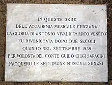 In 1939, with Casella, Chigi Saracini set up the "Settimane musicali Senesi" ("Musical Weeks of Siena") of the Accademia, to be held in September at the conclusion of the courses of instruction: the first was devoted entirely to Vivaldi. These "settimane", which arose from the idea of the Festival Settimana of 1928,[5] became a landmark in the rediscovery of Italian instrumental music of the 1600s and 1700s:[10][18] music of Vivaldi, Alessandro and Domenico Scarlatti, of Pergolesi, Galuppi and Caldara was edited and performed. In 1941 the Count edited a volume of Notes and documents on the Early Venetian School, for the celebratory week of concerts.[19]