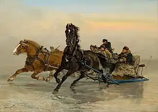 Between 1860 and 1890, he participated in several exhibitions at the Royal Swedish Academy of Fine Arts, but his works (mostly pictures of horses) received little serious attention.[1] In 1889, a fire broke out at his estate and the main building was destroyed. Some paintings were rescued and sent to the local Vänermuseet, but they made no attempt to rebuild and moved to Göteborg. His younger children were sent to boarding schools and, until his death, he spent the summers at one of the surviving buildings on his estate.[1]