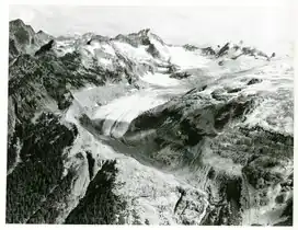 Gunsight Peak (8,198 feet (2,499 m)) is in Wenatchee National Forest in the U.S. state of Washington.[3] On the east slopes of Gunsight Peak lies Blue Glacier while to the west lies the larger Chickamin Glacier. The tallest of a series of peaks along Blue Mountain, Gunsight Peak is a challenging climb and ropes are recommended.