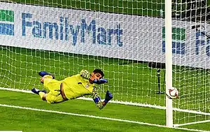 He was then called up to the 23 men senior Indian squad for the 2011 AFC Asian Cup. He made his debut against Turkmenistan in a 1–1 draw.[53] He was called up to the 2018 FIFA World Cup qualifier squad against Nepal but was unused in both legs.[54] Gurpreet made his second appearance for the senior team against Iran in a 2018 World Cup qualifier at Bangalore, starting in a 0–3 defeat.[55] He made his next appearance against Turkmenistan in a 2–1 loss on 8 October.[56] He also kept a clean-sheet against Guam on 12 November 2015, a game that ended 1–0.[57] He kept his second clean sheet against Sri Lanka in a 2–0 win in the SAFF Suzuki Cup 2015.[58] In 2016, he captained the India national team against Puerto Rico[59] and played an essential role against India's 1–0 victory against Kyrgyzstan in a 2019 AFC Asian Cup qualification game in 2017.[60][61]