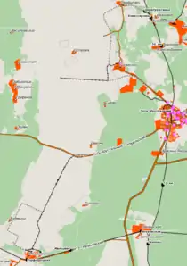 Gusevskoye peat railway emerged in the 1920s, in the area Gus-Khrustalny District, in a settlement named Gus-Khrustalny in 1931 became a town. The railway had a maximum length of about 100 kilometres (62 mi) at their peak.[1] Gusevskoye railway was built for hauling peat and workers and operates year-round with several pairs of trains a day. At present only 25 kilometres (16 mi) of the railway is operational, current operations include passenger traffic (workers-tourists) and freight traffic, transportation of peat. A peat briquette factory was built and put into operation in 2010 in a settlement named Gusevskiy.[2] A peat briquette factory was built and put into operation in 2011 in a settlement named Mezinovskiy.[3] About 2011 half of the railroad was dismantled. Formed two separate railway network.