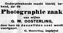 Gustaaf Martinus Oosterling (30 June 1873 – 11 January 1928) was a Surinamese photographer, who had a photo studio on the Gonggrijpstraat in Paramaribo. Before turning to photography, Oosterling worked as a draughtsman, calligrapher and painter.[1][2] Together with Augusta Curiel, Karl Friedrich Ludwig Eugen Klein, Julius Eduard Muller, W. Amo and Théodore van Lelyveld, he is considered a pioneer of photography in Suriname.[3]