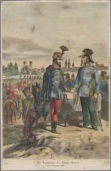 At the end of August all of the mobile Hungarian troops surrendered, as well as the fortresses, with the exception of Pétervárad, which held until 7 September.[43] Only the fortress of Komárom refused to surrender. On 5, 7, 10, 25 and 27 September the Hungarian defenders fought with success against the enemy troops, furthermore the Hungarian Hussars executed successful sorties against the besieging army. For example, on 5 September 300 hussars, led personally by Klapka, routed a Russian Cossack unit in the Battle of Hetény.[36][44]