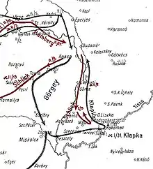 Before this the Upper Tisza Corps was led by the Minister of War General Lázár Mészáros, who was defeated by the Austrian troops led by Lieutenant-General Franz Schlik in the Battle of Kassa.[8] Klapka took over these beaten troops in January 1849, reorganized them, and beat Schlik in three consecutive battles at Tarcal (20 January), Bodrogkeresztúr (23 January), and Tokaj (31 January).[5] Thanks to these victories Klapka held the Hungarian defensive line along the Tisza river, and won precious time for the Hungarian commandment to organize the counter-attack against Windisch-Grätz imperial troops.[6] From 29 January 1849 he was under the command of Lieutenant-General Henryk Dembiński the main commander of the Hungarian armies.[5] After their victory at 5 February 1849 in the Battle of Branyiszkó, the Upper Danube Corps led by Artúr Görgei approached to the Tisza river from North-West, menacing, together with Klapka's corps, to encircle and destroy Schlik's army.[9] Understanding the importance of this chance, Klapka tried to convince Dembiński, to attack from the South Schlik's corps, but the latter refused, ordering Klapka to retreat.[5] This wrong decision of the main commander enabled Schlik to escape the danger, and to retreat.[5] Klapka defeated him again on 8 February at Hidasnémeti, but the Austrian general was able to retreat towards West, joining the main imperial troops led by Windisch-Grätz.[6]