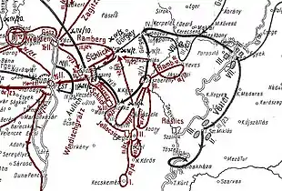 In the night of 29–30 June Klapka sent troops on the left bank of the Danube, chasing away the Austrian troops from the North-West of Komárom.[37] In the night of 3 August 1849, Klapka personally led the Hungarian troops to the right bank of the Danube, attacking the Austrian blockade around the fortress, crushing the imperial forces led by Lieutenant Field Marshal Anton Csorich in the Fourth Battle of Komárom, causing them 1,500 casualties, capturing 30 cannons, many thousands of rifles, ammunition and an entire herd of oxen.[38] This was the last important battle won by the Hungarians in the Hungarian War of Independence.[39] After the battle Klapka's troops advanced to the west and occupied the city of Győr, liberating a huge territory from North Transdanubia, cutting the connection and supply lines between Vienna and the troops led by Haynau in Central Hungary.[39] Hearing the news of this victory the citizens of Székesfehérvár revolted against the occupying Austrian forces and chased them away.[40] Klapka started recruitment from the liberated territories, which added 5,000-6,000 new recruits to his troops, and planned to attack the Austrian province of Styria.[41]