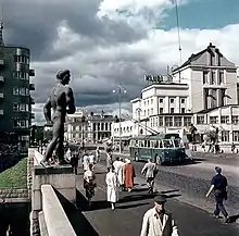 Hämeensilta (the ″Häme Bridge″) is a bridge in Tampere, Finland, crossing the Tammerkoski rapids. The main street of Tampere, Hämeenkatu, runs along the bridge, connecting the Kyttälä district to the western parts of the city center. Hämeensilta is one of the city's best known landmarks, especially famous for the statues on the rails of the bridge.[1] The arches of the bridge are made of concrete and they are coated with a red granite. The 68-metre-long (223 ft) Hämeensilta was completed in 1929.[2] It is named after the Finnish name of the Tavastia province.