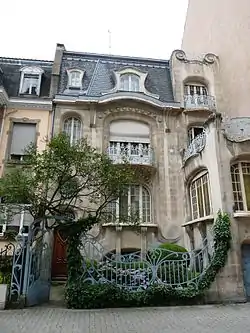 The hôtel particulier was built by the architect, Auguste Brion (1861–1940), for himself in 1904. Brion, the scion of a family of artists directly related to the legendary Friederike Brion, was a prolific architect who built four other houses in the same street between 1903 and 1905.[2] The hôtel is executed in a more exuberant style than most of Brion's other realizations. For the structure, the architect used timber framing and walls of reinforced concrete the surface of which he then covered with stonemasonry. Between 1926 and 1972, the Hôtel Brion was used as an actual hotel, called Hôtel Marguerite. It is again in private hands since 1980.[3]