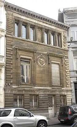 The building, with a strong Renaissance influence, was built in 1882[1] and is decorated with sgraffiti.[2] It was the first time these were applied on a large scale in Brussels. They were drawn by sculptor Julien Dillens and executed by architect Jean Baes. The sgrafitti are four. Under the entablature of the two large windows, each has a narrow acanthus motif. Above it, a water-themed frieze depicts Triton and a siren surrounded by dolphins and putti. Between the columns is an allegory of architecture (plumb in hand and foot resting on a piece of Ionic column). The medallion between the windows is by Dillens and represents Minerva.[3] The text τεχνων εραστρια means 'she who loves art'.[4]