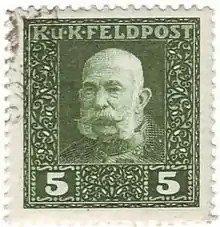 WW1 Austro-Hungarian Military "Feldpost" stamp, 1915, Mi Nr 25, 5 heller, engraved by F. Schirnböck.