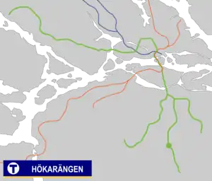 Hökarängen metro station is on the green line of Sweden's Stockholm metro, located in Hökarängen, Söderort. The station was inaugurated on 1 October 1950 as part of the inaugural stretch of Stockholm metro between Slussen and Hökarängen. On 18 November 1958 the line was extended south to Farsta.[2] The distance to Slussen is 7.7 km (4.8 mi).