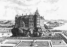 Hörningsholm Castle (Swedish: Hörningsholms slott) is a manor house and former castle in Sweden. It is located on a cliff by an inlet of the Baltic Sea some kilometres from Södertälje. The castle was most probably built by the Sture family during the late 15th and early 16th century, was burnt to the ground by Russian troops in 1719 and rebuilt in its present shape by architect Carl Hårleman. It was renovated in 1919-20 by architect Ivar Tengbom.
