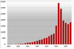 A risk-factor analysis of reported cases showed that the proportion of intravenous drug users infected with HIV-1 increased from 1.7% (13/772) in 2002, to 8.1% (70/862) in 2003, to 41.3% (628/1520) in 2004, to 72.4% (2461/3399) in 2005, and dropped to 68.6% (2017/2974) in 2006.[4] The most important risk factor for Taiwanese intravenous drug users is needle-sharing, followed by the sharing of heroin diluents.[6] A molecular epidemiological study showed that more than 95% of intravenous drug users with newly diagnosed HIV-1 in 2004 and 2005 were infected with CRF07_BC, a circulating recombinant form of subtypes B' and C.[7][8] Previously, several studies suggested that CRF07_BC originated in China's Yunnan province as a mix of subtype B' from Thailand and subtype C from India. The subtype is believed to have moved to Xinjiang in China's northwest along a major heroin-trafficking route.[9]
