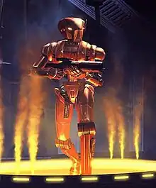 At the 2004 Game Developers Choice Awards, the HK-47 character won the category of "Original Game Character of the Year".[8] The character also won Computer Gaming World's 2003 "NPC of the Year" award.[9] GameSpot called the character one of the coolest characters of 2003, saying he was possibly the most original Star Wars character in years.[10] GamesRadar listed HK-47 as the 3rd best conceived character in video gaming, calling him "cheerfully insane" and saying he was "[e]asily the highlight of the [Knights of the Old Republic] series".[11] IGN chose the character as the 13th top Star Wars hero.[12] GameDaily's Robert Workman called HK-47 one of his favourite characters from Star Wars video games.[13] GameDaily's Chris Buffa also listed the assassin droid as one of their top 25 video game robots, praising its humour and in-game value.[14] UGO Networks listed the character as one of the top 50 Star Wars expanded universe characters, noting his sarcastic personality made him unique among droids.[15] GamesRadar's identified HK-47 as an example of BioWare's "Kickass Robot" character archetype,[16] and listed it as one of the 25 best new characters of the decade, stating that Star Wars: Knights of the Old Republic and HK-47 had some of the best characterization in Star Wars history, adding that HK-47 was one of the most memorable characters in the game.[16][17]