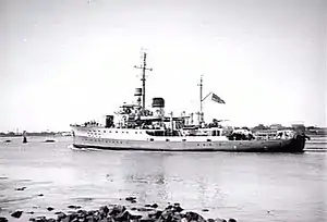 Ballarat was present in Tokyo Bay on Victory over Japan Day (2 September 1945), when the Japanese Instrument of Surrender was signed.[12] She was then deployed on minesweeping duties in the Hong Kong area, during which she struck a mine on 6 November 1945.[3] She returned to Melbourne on 13 December, and was decommissioned into reserve on 27 September 1946.[3] Ballarat's wartime service was recognised by three battle honours: "Pacific 1941–45", "New Guinea 1942–44", and "Okinawa 1945".[2]