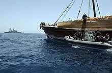 A boarding party from Te Mana commencing inspection of a dhow in the Gulf of Oman during May 2004