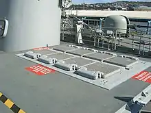 As designed, the main armament for the frigate is a 5-inch 54 calibre Mark 45 gun, supplemented by an eight-cell Mark 41 vertical launch system for RIM-7 Sea Sparrow, two 12.7-millimetre (0.50 in) machine guns, and two Mark 32 triple torpedo tube sets firing Mark 46 torpedoes.[13][19] They were also designed for but not with a close-in weapons system (a Phalanx CIWS installed shortly after the frigate's completion, supplemented by two Mini Typhoons from 2006 onwards), two quad-canister Harpoon missile launchers, and a second Mark 41 launcher (neither of which have been added to the New Zealand ships).[13][22][23] The New Zealand Anzacs initially operated with a Westland Wasp helicopter, which were later replaced by Kaman SH-2 Seasprites, then Kaman SH-2G Super Seasprite helicopters.[13][24]