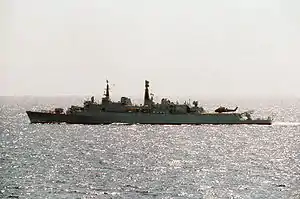 Antrim first commissioned in 1970 and served her first commission in home and Mediterranean waters.[1] In the mid-1970s, the Royal Navy removed 'B' turret and replaced it with four Exocet missile launchers to give her a greater anti-ship capability. After installation of the Exocet missiles it was found that the missile could be activated by small arms fire, so armoured plates were fitted to the outer sides of the missiles containers.