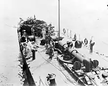 Armament consisted of one 4 in (100 mm) BL Mk VIII gun forward and three 3 in (76 mm) QF 12-pounder 12 cwt guns aft.[lower-alpha 1] Torpedo armament consisted of two 21 in (530 mm) torpedo tubes, one placed forward of the . Two spare torpedoes were carried.[13][14] On 8 April 1916, the Admiralty approved fitting the destroyer with depth charges. Initially, two charges were carried.[15] This was increased to 30 to 50 charges during 1918.[16] The ship had a complement of 96 officers and ratings.[9][11]