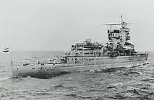 HNLMS De Ruyter (Dutch: Hr.Ms. De Ruyter) was a light cruiser of the Royal Netherlands Navy. She was originally designed as a 5,000 long tons (5,100 t) ship with a lighter armament due to financial problems and the pacifist movement. Later in the design stage, an extra gun turret was added and the armor was improved. She was the seventh ship of the Dutch Navy to be named after Admiral Michiel Adriaenszoon de Ruyter.
