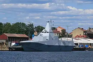 HSwMS Härnösand is the third ship of the Visby-class corvettes.[2] It was built by Kockums at the Karlskrona naval base, and was the first of four vessels of the class which are designed for coastal warfare.[3]