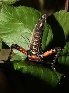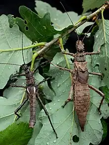 Both sexes, like all species of this genus, have many pointed spines on their bodies and legs. The shortened tegmina has developed front wings completely cover the just as shortened hind wings. Females are dark brown in color and very compact in shape. The abdomen of egg-laying specimens in particular bulge in shape. The abdomen ends in a spike-like secondary ovipositor. Characteristic is a triangular or oval area in front of the wings, which is white to beige in the otherwise black-brown female nymph and only light brown to beige in the adult, then-brown females. In contrast to the top, the bottom is very vividly drawn. Female nymphs in particular have bright orange areas on the undersides of the femura, the meso- and metathorax, the intermediate membranes of the abdominal segments and other smaller orange areas on the sternites of the abdomen itself. Females are larger than males, being 90 to 110 millimetres (3.5 to 4.3 in) long. The males are much slimmer, very prickly and only about 65 to 75 millimetres (2.6 to 3.0 in) long. They are mostly dark brown in color and thus more closely resemble the nymphs in their coloration. With them, the front edge of the tegmina is often drawn lightly, which results in two short, light lines at the lateral edge of the wings.[2][3]