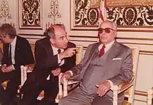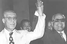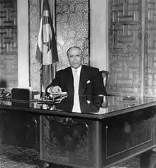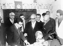 The speeches and determination to act of this new generation of nationalist was greatly welcomed by the Tunisian population which did not hesitate to criticize the "neglect of the Destour leadership to defend their interests".[50] Upon the refusal of the executive committee to organize a special congress aiming to change their political orientations and thanks to the support of the population and notables, the "secessionists" decided to hold their own congress in Ksar Hellal on 2 March 1934.[51] During the event, Bourguiba called the representatives to "choose the men who shall defend in their name the liberation of the country". The congress ended with the founding of a new political party, the Neo-Destour, presided by El Materi, and Bourguiba was designated chairman.[52]