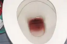 Haematochezia is the passage of fresh blood through the anus, usually in or with stools (contrast with melena).[1] The term is from Greek αἷμα ("blood") and χέζειν ("to defaecate"). Hematochezia is commonly associated with lower gastrointestinal bleeding, but may also occur from a brisk upper gastrointestinal bleed. The difference between hematochezia and rectorrhagia is that, in the latter, rectal bleeding is not associated with defecation; instead, it is associated with expulsion of fresh bright red blood without stools.[2] The phrase bright red blood per rectum is associated with hematochezia and rectorrhagia.
