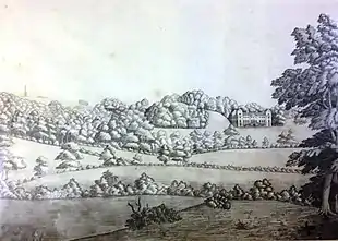A park adjacent to the former manor house at Hagley was mentioned in the 14th century as having an embanked ditch as boundary, traces of which still remain.[2] The grounds eventually fell into disuse and were only renewed at the end of 17th century by Charles Lyttelton. It was his grandson George, however, who was chiefly responsible for landscaping them in the Neoclassical taste and making them one of the foremost examples of the style in England.[3] In particular he started a tradition of abandoning the European taste for formal gardens, incorporating instead the natural beauty of the landscape. The charm of the grounds was further underlined by the creation of buildings in diverse styles: some that recreated ancient Greek and Roman examples, another being a gothic folly. About the grounds were various inscriptions underlining the fact that this was a literary landscape which reflected the shaping vision of some of the leading poets of the 18th century.[4]