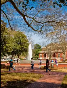 The main campus, also known as the east campus, is about 530 acres (2 km2) in an urban residential area of downtown Greenville. The 158 buildings on main campus comprise more than 4.6 million square feet (325,000 m2) of academic, research, and residential space.[8] Many of the Main Campus buildings feature the Spanish–Mission style architecture; inspiration drawn from Thomas Jarvis' time as an ambassador to Brazil.[19][20] He wanted to bring the unique architecture to eastern North Carolina. On the main campus, there are five districts: Campus Core, Downtown District, Warehouse District, Athletic fields and the South Academic District. On the Campus Core, there are 15 residence halls which are divided into three separate neighborhoods.[21] The distinct feature of the main campus is the mall, which is a large tree–laden grassy area where many students go to relax. In the middle of the mall is the replica of the cupola on the original Austin building.