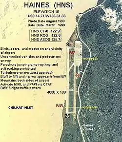 Haines Airport (IATA: HNS, ICAO: PAHN, FAA LID: HNS) is a state-owned public-use airport located three nautical miles (6 km) west of the central business district of Haines,[1] a city in the Haines Borough in the U.S. state of Alaska. It is the primary airport serving the Haines, Klukwan, Haines Borough area and is situated on the Haines Highway, directly adjacent to the Chilkat River.