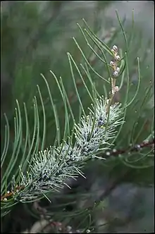 Hakea lehmanniana, commonly known as the blue hakea,[2] is a shrub in the family Proteacea. It has needle-shaped prickly leaves and blue flowers during winter months. It is endemic to an area in the southern Wheatbelt and Great Southern regions of Western Australia.