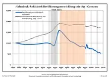 Development of Population since 1875 within the Current Boundaries (Blue Line: Population; Dotted Line: Comparison to Population Development of Brandenburg state; Grey Background: Time of Nazi rule; Red Background: Time of Communist rule)