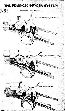 Cutaway view of the action of the Remington-Ryder No. 22 breech-loading rifle, which loads only with the hammer at half cock. Figure 1: Arm at the moment of discharge. Figure 2: Open to receive the cartridge. Figure 3: At half cock, loaded.