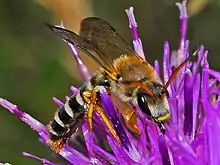 Halictus sexcinctus is a species of ground-nesting bees, previously thought to only exhibit solitary behavior.[3] They are relatively large compared to other sweat bees.[4] They are 14–16 mm in length, and have white felt bands on their abdomens.[5] Workers are typically smaller than foundresses, while foundresses will usually be the largest and most worn individuals in the nest.[4] Sterile and reproductive workers do not differ in size.[6]