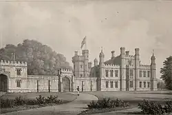 The house was designed by the architect John Buckler and built between 1824 and 1827 for Robert Grosvenor, who was at the time the 2nd Earl Grosvenor, and later the 1st Marquess of Westminster. The building of the castle was supervised by Benjamin Gummow, the Earl's architect and surveyor.[2] It was used as a sporting lodge and, on occasions, for living accommodation.[1] In 1886 the Chester firm of architects, Douglas and Fordham, added an extension in Elizabethan style for the 1st Duke of Westminster.[3] The extension consisted of a wing containing a new drawing room. Internal alterations were made which included a staircase, and a chimneypiece in the dining room.[4]