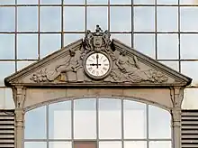 The stone base structure was originally used for the storage and sale of grain and flour. The glass and metal pavilion housing the main market hall is of a modular design, with 80 pillars forming the perimeter and a further 20 interior pillars supporting the roof.[4] It has a church-like structure, with a large central "nave" flanked by two smaller side aisles.[1][4] The roof is fitted with a skylight to allow natural light to enter and its height of 12 metres was chosen to avoid a build up of humidity inside.[1][7] The main entrance to the market hall is adorned with additional columns and a pediment featuring a clock and reliefs of Mercury, the Roman god of commerce, and Ceres, the goddess of agriculture.[1][7] Covered walkways flanking the longer sides of the pavilion were added in the late 1920s,[nb 1] and the building was electrified in 1950.[2] The market complex was inscribed (a level of protection granted to buildings and objects of regional importance) to the list of historic monuments on 14 May 1987.[1]