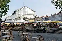 Les Halles de Niort (French pronunciation: [le al də njɔʁ], English: Niort Indoor Market) is a market hall in the town of Niort, in the French department of Deux-Sèvres. Niort has had covered markets since the 13th century and there have been three structures known as the "Halles de Niort".[3] The original market buildings were located in the centre of the town on what is now Rue Victor Hugo, a pedestrianised shopping street. After these were demolished in 1793, Niort's market moved to its present site on the banks of the Sèvre Niortaise. The current building, consisting of a metal and glass pavilion atop a stone-built base, was inaugurated in 1871. It was inscribed as a monument historique and listed in the Base Mérimée in 1987.[1]