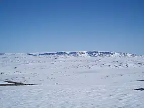 In the north, there is a large dammed lake called Strandavatnet. The Bergen Line railway, which runs south of Hallingskarvet, has its highest stop at Finse Station at an elevation of 1,222 metres (4,009 ft).[2]