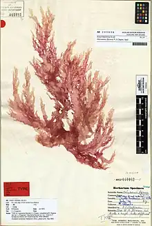 13. De Azevedo, Arau´joarau´arau´jo; Cassano, Valériaval´valéria; Oliveira, Mariana Cabral (May 2016). "Diversity of branched Halymenia (Halymeniales, Rhodophyta) species on the Brazilian coast: Molecular and morphological analyses reveal three new species". Phycologia. 55 (4): 431–444. doi:10.2216/15-126.1. S2CID 88771681.